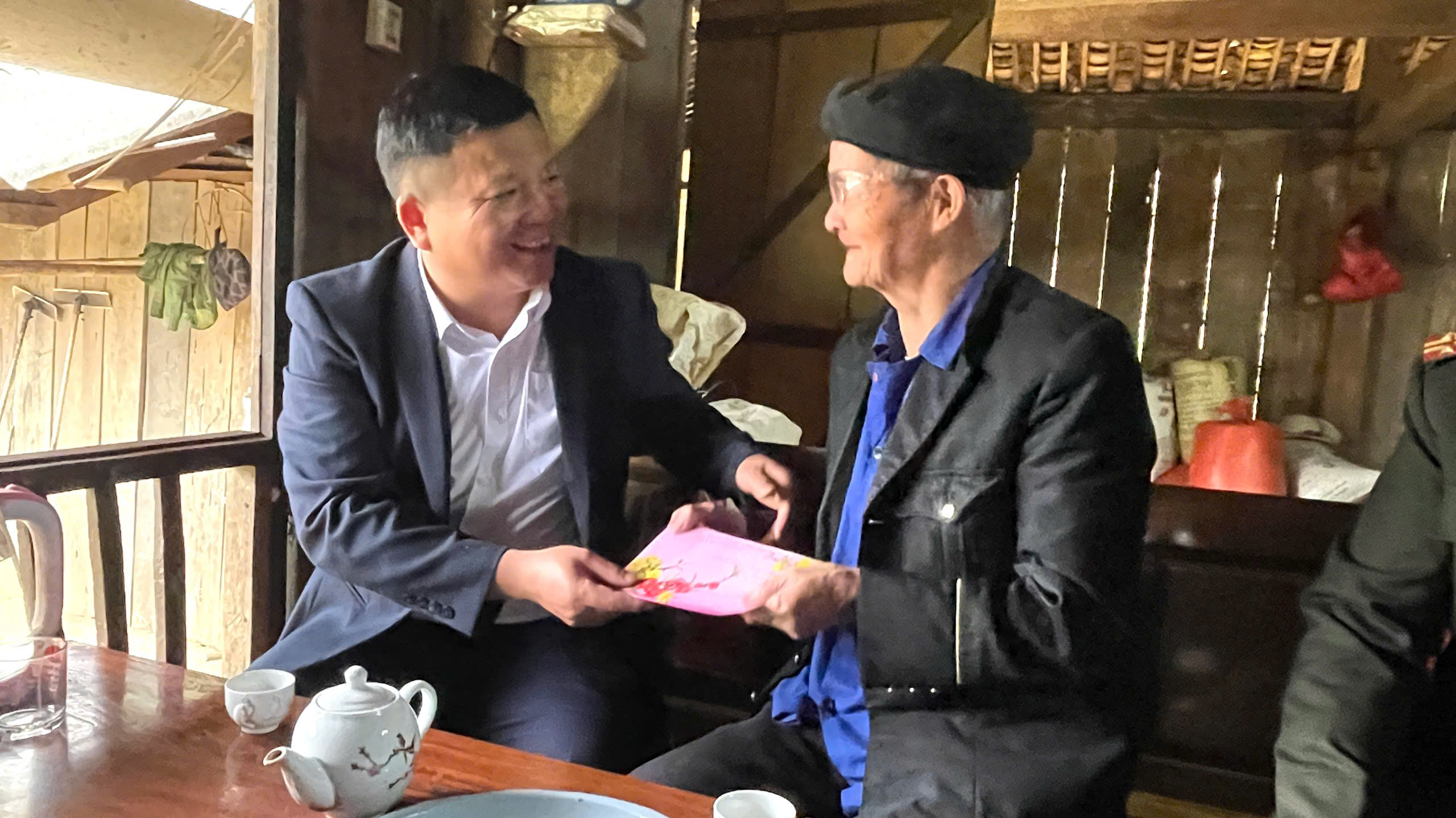 Đồng chí Vũ Việt Bắc, Phó Bí thư thường trực Đảng ủy xã thăm tặng quà gia đình chính sách, chúc thọ người cao tuổi tại thôn Lũng Danh, Khuổi Tấy.